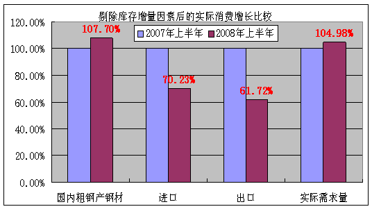 (圖1、2)2008年上半年,已經(jīng)出現(xiàn)許多影響國內(nèi)不銹鋼需求的因素,但由于國內(nèi)經(jīng)濟總體上快速增長,上半年,國內(nèi)不銹鋼表觀消費同比增長率8.50%,與上年增長幅度10%-15%之間相比,增長速度有所放緩,但仍然表現(xiàn)出較高的水平,但是增長速度放緩,考慮市場和鋼廠庫存增長因素,實際需求增速仍保持5%左右增長速度。上半年實際需求增長幅度下降趨勢比表觀消費增長放緩嚴(yán)重;不銹鋼增長速度明顯放緩的根本原因是宏觀經(jīng)濟增長放緩;對國內(nèi)不銹鋼產(chǎn)業(yè)造成超過國內(nèi)消費放緩水平壓力的主要原因是世界經(jīng)濟不好;國家進(jìn)出口貿(mào)易政策變化加劇了國內(nèi)不銹鋼產(chǎn)業(yè)面臨的困難。特別是國家關(guān)于不銹鋼深加工制品出口貿(mào)易政策的變化,造成了不銹鋼冷軋寬板進(jìn)口數(shù)量的逆市上升。