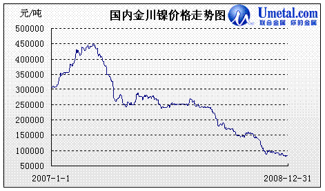 (2)國內(nèi)鎳市:圖4:2008年國內(nèi)金川鎳價格走勢基本與國際鎳價接軌,價格由年初的242000元跌至84000元,跌幅達(dá)65%。