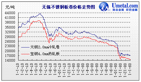 08年下半年隨著美國次貸危機轉(zhuǎn)化為國際金融危機,金融行業(yè)三季級度損失慘重,對于基金炒做的期貨市場更是經(jīng)歷一場嚴(yán)寒,作為不銹鋼重要原料之一的鎳, 07年5月份價格漲至歷史最高水平,達(dá)到51600美元/噸;隨后受下半年美國次貸危機影響價格一路跌至26000美元,跌幅高達(dá)49.6%。鎳價在08上半年雖有回頭之勢,但隨著全球金融危機的爆發(fā),鎳價由08年初的26000美元一度跌破10000美元大關(guān),10月份對于期貨市場來說無疑更是一場惡夢,單月跌幅達(dá)6700美元/噸,隨后便一蹶不振。對于不銹鋼市場走勢來說,在需求不斷縮減,原料成本大幅下跌,市場價格不斷走低的情況下,不銹鋼廠被迫開始施行“減產(chǎn)保價”政策,據(jù)聯(lián)合金屬網(wǎng)統(tǒng)計最后一個季度鋼廠產(chǎn)量只維持原有水平的40-50%。