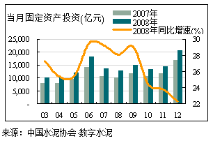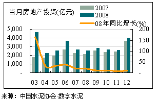 城鎮固定資產投資單月投資額增速繼續下滑,但總量首次突破20,000億元。在中央新增投資1000億元的情況下,2008年12月完成城鎮固定資產投資20,553.11億元,首次單月突破20,000億元,同比增長22.27%,增速為今年各月最低,較11月又低了1.5個百分點,投資增速連續三個月同比下降。