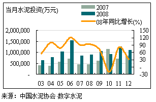 水泥行業的投資還沒有受到經濟下行的帶來的明顯沖擊。12月當月完成投資109.32億元,同比增長31.33%,較11月份回落了49.28個百分點;1~12月水泥行業累計投資突破一千億元,達1,051.46億元,增長60.76%。