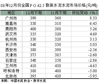 主要受年底工程收尾、需求量增加的刺激,廣東、江西、貴州、湖北、浙江、湖南六省的水泥價格實現了10~30元的上漲,其中以廣東價格上漲幅度較大,為8.33%;而陜西、天津、河北、甘肅、內蒙、北京的價格卻不同程度的下降,其他以北京為最,下降了35元/噸,主要是由于今年受經濟形勢影響新房地區開工項目少的可憐,以及奧運會結束后北京地區重點工程減少的影響。