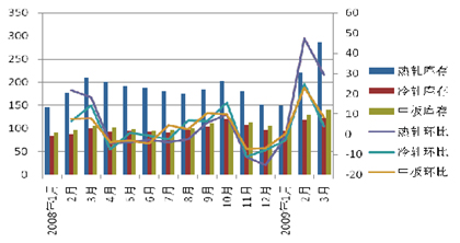 (2)承接去年11月中旬的上升走勢,進(jìn)入2009年以來,2月份以前鋼材曾持續(xù)上升,鋼廠和流通商信心大振,鋼廠忙于擴大和恢復(fù)產(chǎn)能,而流通商則忙于填充幾近荒廢的料場,一時間購銷兩旺,雖然天氣依然寒冷,但市場儼然已經(jīng)提前享受春天的溫暖了。作為國內(nèi)的風(fēng)向標(biāo),寶鋼、武鋼等鋼鐵巨頭相繼上調(diào)其2月、3月出廠價格,其中熱卷價格上調(diào)了400元/噸、冷板上調(diào)了600元/噸、鍍鋅板上調(diào)650元/噸。國內(nèi)其他鋼廠也相繼上調(diào)出廠價格。但是在2月上旬,鋼價再次進(jìn)入下降通道,并且在3月初跌回上輪價格漲前水平。鋼材價格的迅速回落,使市場上快速積累起來的鋼材庫存進(jìn)入尷尬的兩難境地,一方面庫存高企卻面臨需求萎縮、價格下跌的困境,另一方面若本輪再采取低價拋售回籠資金的話,除代價很大外,庫存主體已經(jīng)由鋼廠轉(zhuǎn)為流通商了。