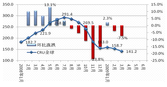 從CRU綜合鋼材價(jià)格指數(shù)變化情況看,至今年3月中下旬,CRU綜合鋼材價(jià)格指數(shù)已降至141.2點(diǎn),比去年最高的291.4點(diǎn)(7月)累計(jì)下跌了51.5%。并且自去年8月份至11月份,連續(xù)4個(gè)月環(huán)比跌幅呈持續(xù)擴(kuò)大的態(tài)勢,至去年的11月份,單月環(huán)比跌幅達(dá)23.8%。自去年12月至今年2月份,價(jià)格環(huán)比跌幅一度呈縮小的態(tài)勢,今年3月份,CRU國際鋼材綜合價(jià)格指數(shù)跌幅又有所擴(kuò)大。不管怎樣,國際鋼價(jià)深度下跌的時(shí)期應(yīng)經(jīng)渡過,今年以來鋼價(jià)雖繼續(xù)下跌,但幅度呈縮小的態(tài)勢。盡管如此我們也還不能列出鋼價(jià)觸底反彈的時(shí)間表。