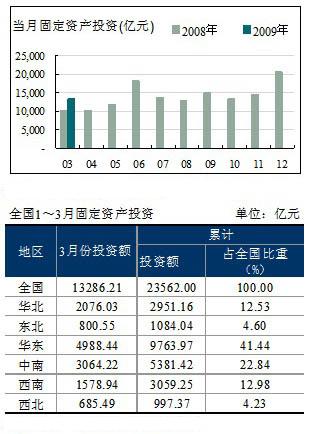 1~3月份城鎮固定資產投資累計完成額23,562億元,同比增長28.60%;其中3月份投資完成額為13286.21億元,同比增長30.31%,投資政策的拉動效應開始顯示。