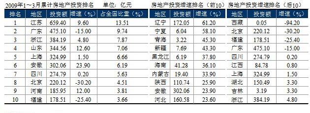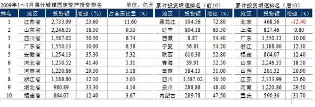 1~3月城鎮固定資產投資增速排名后10中,華東占到了5個,中南為3個,華北、西南各為1個,其中北京地區出現負增長(為-12.40%),固定資產投資大省江蘇、山東、廣東均在其中。