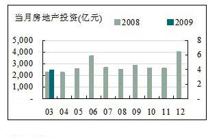 1~3月份房地產投資額為4880.29億元,同比增長4.10%,較2008年同期增速回落了28.2百分點,但與上月增速相比,提高3個百分點。3月份當月完成房地產投資額2482.14億元,同比增長7.27%。似出現房地產回暖跡象,但仍有待時間的考證。
