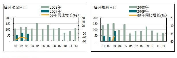 金融危機對整個水泥行業的影響還在繼續,但程度較上月有所減緩。3月份的水泥出口量為62.83萬噸,環比下降11.12%;累計出口量184.88萬噸,同比下降46.15%;平均離岸價50.36美元/噸,同比增長15.13%。水泥熟料出口85.45萬噸,環比上升122.73%;累計出口量169.67萬噸,同比下降61.12%;離岸價35美元/噸,同比增長5.78%。