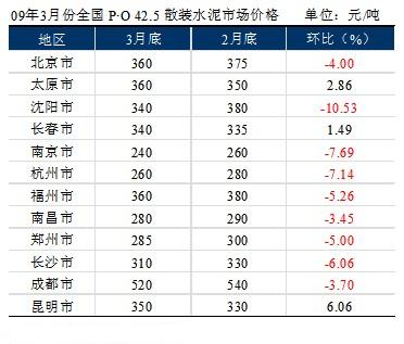 3月份全國水泥市場價格較為平穩。就統計的31個省市情況來看,有9個地區價格出現不同幅度的下降,其中華東區4個,中南2個,東北、西南各一個;仍然呈現出“西高東低”的態勢。其中,沈陽下降幅度最大,為10.53%(40元/噸);價格上漲城市只有3個,分別為太原、長春和昆明,漲幅較大的昆明每噸上漲20元。