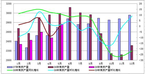5月份以來,受庫存下降及固定資產(chǎn)投資大幅增長對鋼材需求的拉動影響,螺紋鋼、線材以及熱卷等主要品種價格都一路攀升,累計上漲幅度高達(dá)300元之多,市場售價的上揚(yáng)使得鋼廠相繼上調(diào)出廠價格。鋼材市場的走好,無疑是對焦炭市場的有力支撐,鋼廠焦炭庫存消耗較快,采購積極性較大,而焦化企業(yè)長期限產(chǎn),加上精煤資源偏緊,所以焦炭資源也并不寬松,于是焦化企業(yè)抓住了漲價的契機(jī),也陸續(xù)上調(diào)焦炭價格,5月份至今,累計上調(diào)幅度在100元/噸左右。下游市場的好轉(zhuǎn)以及焦炭價格的攀升,讓焦化企業(yè)感受到了春天,于是部分企業(yè)開始加大生產(chǎn)力度,以至于5月份焦炭產(chǎn)量環(huán)比增長10.6%。但是山西焦協(xié)的指導(dǎo)文件明確指出,行業(yè)繼續(xù)嚴(yán)格執(zhí)行50%的限產(chǎn)措施,穩(wěn)定市場供應(yīng)量,降低庫存,減少虧損。在下游鋼材市場沒有根本性好轉(zhuǎn)的情況下,限產(chǎn)確實是焦化行業(yè)自救的唯一出路。