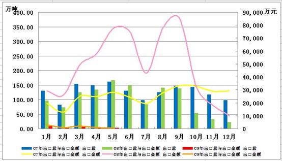 5月份月度出口量再創(chuàng)新低。受國家征收高出口稅率政策及國際金融危機(jī)等因素影響,08年10月起,中國焦炭出口量急速萎縮,并持續(xù)逐月走低。2009年以來,中國焦炭月度出口量均不足10萬噸,5月份月度出口僅2.2萬噸,驟降99%%,為2006年以來月度出口最低水平;當(dāng)月出口均價每噸321.5美元。