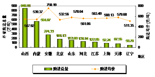從調入的來源地統計(指煤炭經營企業購入煤炭時銷貨方注冊登記所在地),從山西購進848.11萬噸,占調入總量的30.69%;其次是內蒙和安徽,分別購進564.87萬噸和274.33萬噸,占調入總量的20.44%和9.93%(見圖1)。