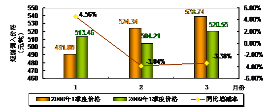 (1)煤炭市場供應彈性依然較大。受國際市場價格和我國煤炭進出口政策影響,2009年一季度國內煤炭進口迅速增加、出口急劇減少,煤炭可供資源增多,據統計,國內沿海地區比2008年同期增加515萬噸的煤炭資源。一季度以來,煤炭需求逐步轉入季節性淡季,隨著氣溫回暖,用煤高峰結束,煤炭需求下降,煤炭市場供應彈性較大,價格受供求關系影響逐步走低。