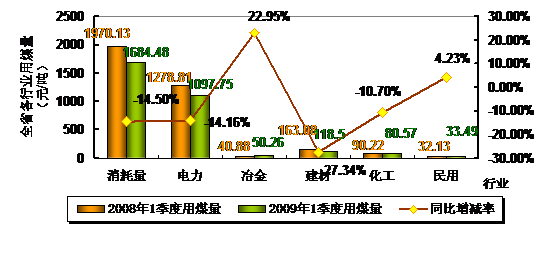圖4:2009年一季度全省各行業用煤與去年同比變化情況
