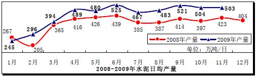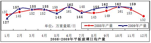 根據(jù)國家統(tǒng)計局數(shù)據(jù),2009 年1-11 月份累計水泥產(chǎn)量14.93 億噸,同比增長19%,其中11 月當月產(chǎn)量15096 萬噸,同比增長18%,日均產(chǎn)量環(huán)比下降0.23%。2009 年1-11 月份平板玻璃產(chǎn)量5.17 億重量箱,同比增長2.2%,其中11 月當月產(chǎn)量4782.78 萬重量箱,同比增長6.4%,日均產(chǎn)量環(huán)比下降1.64%。