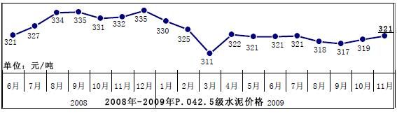 據(jù)中國建筑材料聯(lián)合會統(tǒng)計,2009 年11 月份重點聯(lián)系水泥企業(yè)42.5 級普通硅酸鹽水泥平均價格為321.37 元/噸,環(huán)比增長2.34 元/噸,比去年同期下降10.51 元/噸,降幅為3.17%。