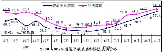 11 月份重點聯(lián)系玻璃企業(yè)浮法玻璃平均價格平穩(wěn)增長,為80.6 元/重量箱,環(huán)比增加2.91 元/重量箱,增幅為3.75%,比上年同期上漲7 元/重量箱,漲幅為9.51%;普通平板玻璃價格同步上升,11 月份平均價格為77.4 元/重量箱,環(huán)比增長3.61 元/重量箱,增幅4.89%,比上年同期上漲11.15 元/重量箱,增幅為16.83%。