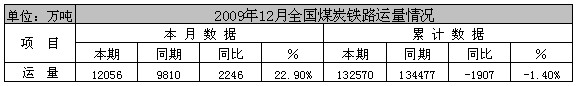 2009年1-12月份我國煤炭鐵路運輸情況統計