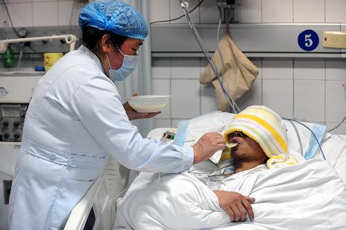 6月7日,在晉煤集團總醫院重癥監護室內,護士為陜西籍獲救礦工邱士富喂食小米粥。
