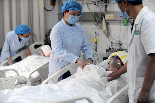 6月7日,在晉煤集團總醫院重癥監護室內,醫護人員在看護獲救礦工。