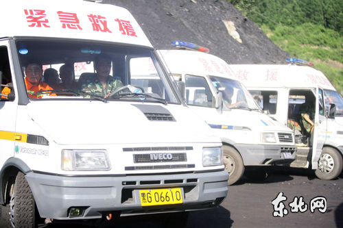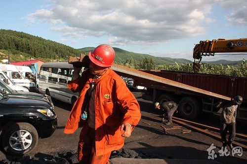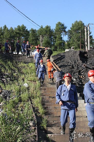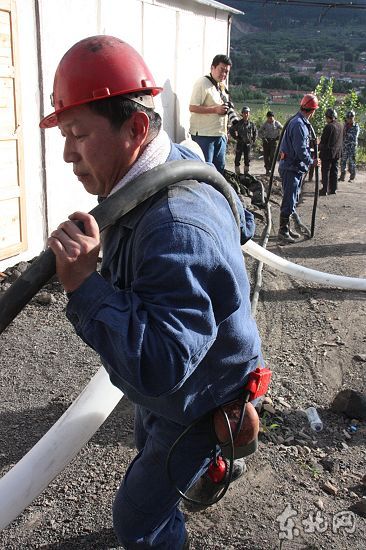 工作人員用肩膀扛著鋼架走上臺(tái)階,陸續(xù)有礦工下來支援。