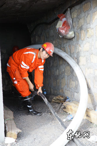 救援隊(duì)員向井內(nèi)輸送排水管線。