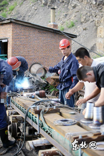 現(xiàn)場(chǎng)工作人員冒著酷熱趕制零件。