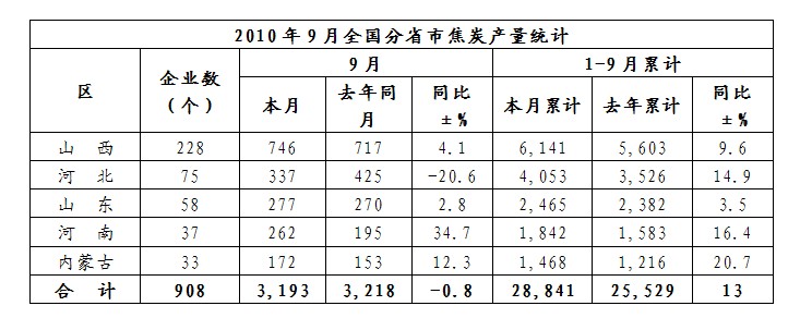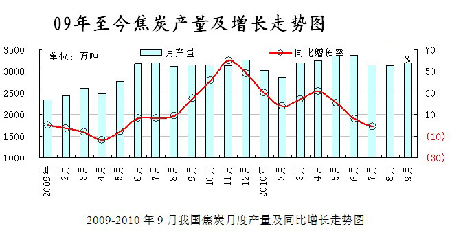 統(tǒng)計(jì)局?jǐn)?shù)據(jù)顯示:2010年9月份中國共生產(chǎn)焦炭3,193萬噸,比去年同期減少25萬噸,同比減少0.8%。中國1-9月焦炭總產(chǎn)量為28841萬噸,累計(jì)比去年同期增加3312 萬噸,同比增長13%。全國煤炭產(chǎn)量24.42億噸,同比增長17.2%。預(yù)計(jì)2010年中國焦炭全年產(chǎn)量有望達(dá)到3.8億噸。
