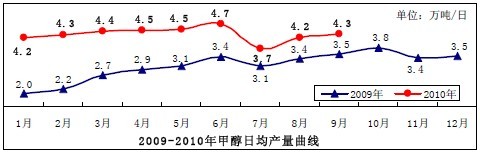 根據(jù)國家統(tǒng)計局?jǐn)?shù)據(jù),9 月份甲醇產(chǎn)量130.1 萬噸,同比增長5.3%,日均產(chǎn)量環(huán)比增長4.0%;1-9 月份累計產(chǎn)量1181 萬噸,同比增長33.1%。