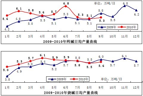根據(jù)國家統(tǒng)計局?jǐn)?shù)據(jù),9 月份純堿產(chǎn)量159 萬噸,同比下降11.1%,日均產(chǎn)量環(huán)比增長2.9%,1-9 月份累計產(chǎn)量1544.5 萬噸,同比增長8.5%;燒堿產(chǎn)量168.9 萬噸,同比增長3.9%,日均產(chǎn)量環(huán)比增長2.4%,1-9 月份累計產(chǎn)量1553 萬噸,同比增長15.7%。