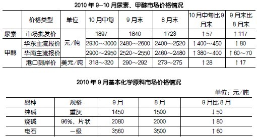 9 月份以來,盡管出口關(guān)稅上調(diào),但國際尿素價格大幅上漲繼續(xù)拉動尿素出口,此外,節(jié)能減排、秋播用肥和國家淡儲也對尿素市場產(chǎn)生支撐作用,尿素價格明顯上漲;國外甲醇價格持續(xù)上揚和通脹預(yù)期背景為國內(nèi)甲醇市場上行提供了較強動力,加上國內(nèi)甲醇裝置開工率較低,甲醇價格大幅上漲;基本化學(xué)原料市場相對穩(wěn)定,市場價格漲多跌少。