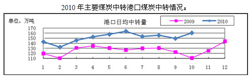 1-10月份,全國主要港口累計完成煤炭發運46150萬噸,同比增加8350萬噸,增長了22.1%。其中,內貿煤炭發運累計完成44580萬噸,同比增加8679萬噸,增長了24.2%,外貿煤炭發運累計完成1570萬噸,同比減少了328萬噸,下降了 17.3%。