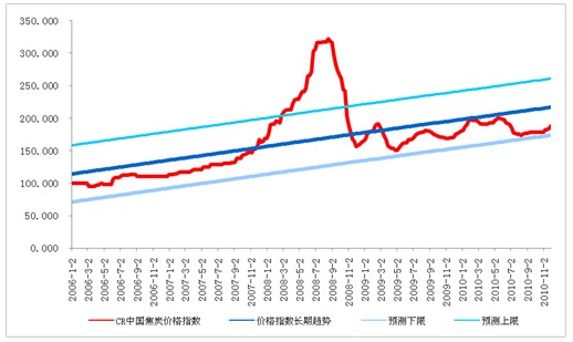 圖2 CR中國焦炭價格指數(shù)歷史趨勢及預(yù)測范圍