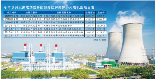 另據上述4家產權交易機構相關負責人介紹,由于小火電項目備受客戶追捧,他們也正在全力尋找關停小火電項目,并爭取把更多的優良項目引入交易所,進行掛牌交易。據北交所信息部主任帥曉姍介紹,北交所很看好關;痣姍C組進場交易的趨勢,并自今年8月份啟動了專項工作組,目前已初步搭建了覆蓋全國的網絡交易體系,在河北、河南等6個省市實現了項目運作,涉及金額超過1億元。