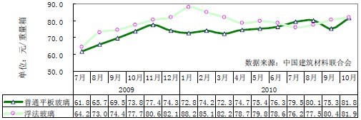 浮法玻璃價格繼續上漲。據統計,10 月份重點聯系玻璃企業浮法玻璃平均價格為81.9元/重量箱,環比增長1.9%,同比漲幅為5.4%;普通平板玻璃價格快速回升,10 月份平均價格為81.8 元/重量箱,環比上升8.7%,同比增幅10.8%。