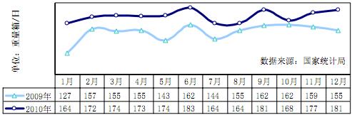 平板玻璃產量繼續上行。據統計 2010 年 12 月產量 5619 萬重量箱,同比增長 11.2%,日均產量環比增加 2.3%,2010 年全年累計平板玻璃產量 6.3億重量箱,同比增長 10.9%。