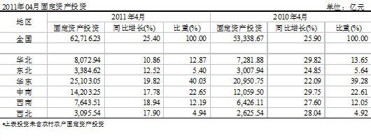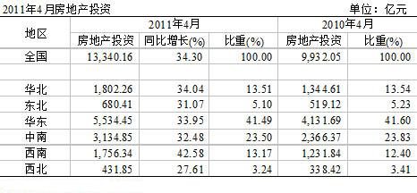 2011年1~4月份,全國累計房地產投資額13,340億元,同比增長34%,房地產投資繼續保持較快增長。