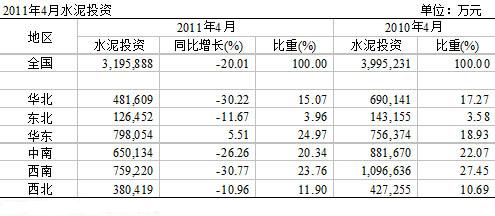 在國家對新建產能的嚴卡下,水泥投資增長繼續回落,2011年4月份全國水泥累計投資319億元,同比負增長20%。