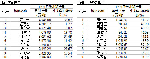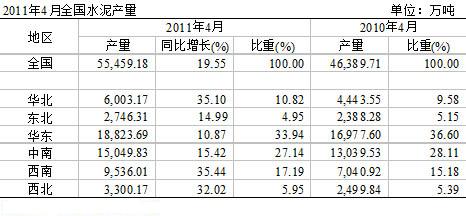 2011年4月份水泥產量5.5億噸,同比增速19.55%。遠超預期,從各大區來看,西南,華北、西北增長均超過30%,其余地區也超過2位數增長,說明1~4月份的水泥市場形式依舊保持旺盛。