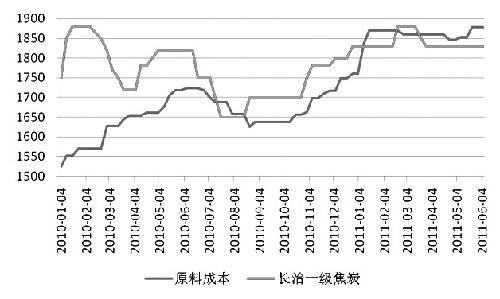 由于焦化行業產能較為分散,產業集中度低,產能優勢并沒有轉化為價格優勢,尤其近幾年受上游高價焦煤和下游強勢鋼企夾擊的焦炭企業經濟效益不容樂觀。一般焦炭的原料成本占到焦炭總成本的90%以上,我們以呂梁離石焦精煤(45%)、臨汾霍州肥精煤(15%)、長治郊區的廋精煤(30%)以及忻州寧武的氣精煤(10%)來計算焦炭的原料成本。從下圖可以知道,焦炭的原料成本基本接近焦炭的現貨價格,但需要注意的是,在現實中焦化企業采購的煉焦煤價格往往比市場價格低,如果除去這部分差價,應該說焦炭的原料成本低于現貨100—200元的價差。