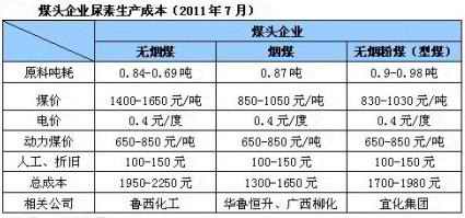 尿素本身屬于資源類產品,生產工藝分煤炭型和天燃氣型兩種,石油制尿素法由于其成本偏高已被業內淘汰。尿素生產中,原料方面至少要占全成本的80%左右。因此,煤炭以及天然氣價格便是尿素價格的風向標。目前,全國有超過72%以上的尿素生產企業以煤為原料。所以,這部分廠家的生產成本可以看成業內標桿。下表所示為截止到2011年7月,煤頭企業的生產成本數據(僅供參考)。這些工廠主要分布于華北、華東以及華中地區,也正好是我國尿素主產區。