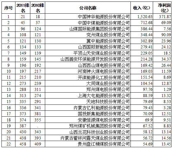 其中,中國神華能源股份有限公司以排名第21位榮登煤炭行業(yè)中國500強的首位。榮登榜單的煤炭企業(yè)共有22家,7家排名下降,14家排名上升,鄭州煤礦機械集團股份有限公司新晉登上榜單。22家煤企的銷售收入達到5310.86億元,凈利潤達到797.57億元。