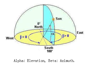太陽在天空中的位置可以由太陽高度角和太陽方位角來確定。太陽高度角又稱太陽高度、太陽俯仰角,是指太陽光線與地表水平面得之間的夾角。太陽方位角即太陽所在的方位,是指太陽光線在地平面上的投影與當?shù)刈游缇的夾角,可以近似看作是樹立在地面上的直線在陽光下的陰影與正南方向的夾角。太陽方位角和高度角的實時數(shù)值可以通過地理經(jīng)緯度、時區(qū)參數(shù)利用公式計算出來。