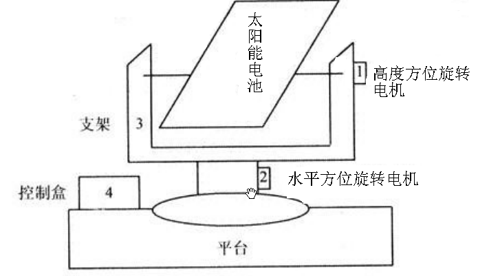 本文所設(shè)計跟蹤調(diào)整裝置其結(jié)構(gòu)如下圖所示:它主要由底座、立軸、橫軸、兩臺旋轉(zhuǎn)電機、傳動齒輪等組成。其中旋轉(zhuǎn)電機1驅(qū)動橫軸,支撐太陽能電池板繞橫軸運動,跟蹤高度角運行。旋轉(zhuǎn)電機2驅(qū)動水平軸,以跟蹤方位角變化。