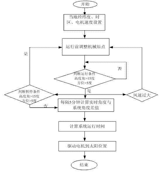通過程序控制,可以自動判斷是否滿足運行條件從而達到自動啟動運行裝置、自動停止、返回初始狀態(tài)等控制。增加風力傳感器用于對系統(tǒng)的保護作用,當風力大于一定數(shù)值時,系統(tǒng)停止工作,復(fù)位到原點,風速滿足工作條件時,系統(tǒng)自動開始工作。太陽能電池板有兩個自由度,控制機構(gòu)對高度角和方位角兩個方向進行調(diào)整。當電池板轉(zhuǎn)到盡頭時,由于跟蹤裝置裝了限位傳感器,到限位觸點時自動切斷輸出,電機停止工作。