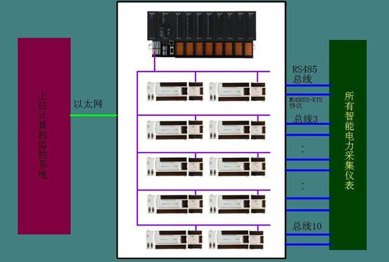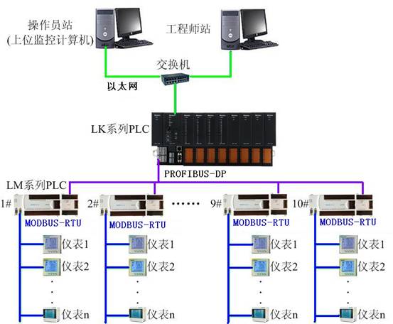 電力采集系統(tǒng)一般由以LK和LM系列PLC為核心的通訊機(jī)柜組成。系統(tǒng)裝置如圖2-1所示。電力監(jiān)控柜里配置有1套LK系列PLC,10套LM系列PLC及電源。每套LM系列PLC均有一個(gè)RS485接口和一個(gè)PROFIBUS-DP接口,其通過RS485串口與智能儀表進(jìn)行通訊,再通過PROFIBUS-DP總線將讀上來的儀表數(shù)據(jù)傳送到LK系列PLC中。LK系列PLC通過以太網(wǎng)通訊將匯總的配電室內(nèi)的所有數(shù)據(jù)傳送到上位監(jiān)控計(jì)算機(jī)。