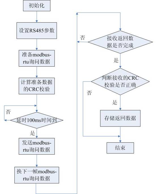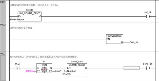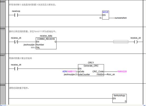 從程序中可以看出所有數(shù)據(jù)的采集和存儲(chǔ)都是由LM系列PLC完成的。通過RS485進(jìn)行詢問幀數(shù)據(jù)的發(fā)送,并對(duì)返回的數(shù)據(jù)進(jìn)行CRC校驗(yàn)判斷,若返回的數(shù)據(jù)不正確,則不進(jìn)行數(shù)據(jù)存儲(chǔ),只有返回?cái)?shù)據(jù)正確時(shí)才將數(shù)據(jù)放到相應(yīng)的寄存器中。