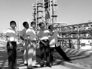 圖為日前在陜西調研的中國石油和化學工業聯合會常務副會長李壽生(右三)在該公司董事長任沛建(右二)陪同下,了解12萬噸/年煤焦油全餾分加氫裝置情況。