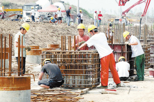 往日沉靜的順堤河西岸,如今一幅壯闊的建設畫卷。隨著大型打樁機陣陣轟鳴,一根根樁基被打入地下。站在千米碼頭施工面上放眼望去,150多名頭 戴黃色安全帽的工人正加緊施工;挖掘機、樁機、吊車、運輸車忙而有序,兩臺高大混凝土泵車,伸出48米長泵管,不停地往樁基里灌漿……