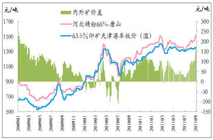 近來由于河北地區(qū)整頓小礦山,致使短期內(nèi)資源緊張。截至2011年9月2日,河北唐山鐵精粉(66%)為1515元/噸,相比2011年8月2日環(huán)比上漲80元/噸,漲幅達6%;較2010年9月2日,同比上漲305元/噸,漲幅約25%。另63.5%印礦天津港車板價(濕)為1350元/噸,較上月同期環(huán)比上漲10元/噸,漲幅為1%;較去年同期上漲195元/噸,漲幅為17%。內(nèi)外礦價差為165元/噸,環(huán)比上升70元/噸。